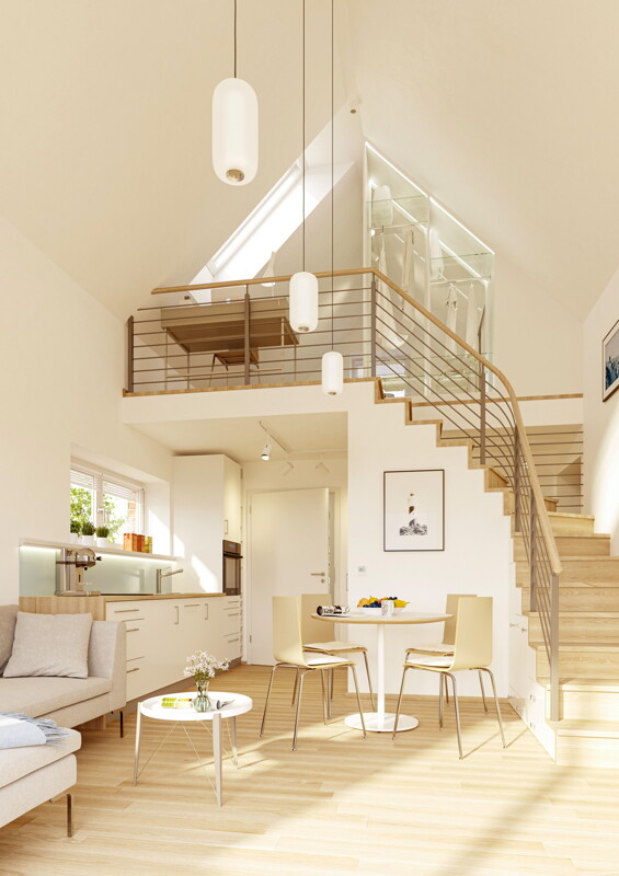 Eine Treppe mit praktischen Staumöglichkeiten (optional) führt auf die großzügige Galerie im Obergeschoss.