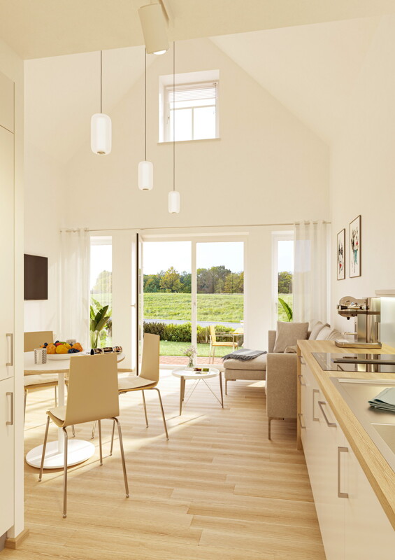 Im Erdgeschoss befinden sich ein großräumiger Wohnraum mit offener Küche, das Bad, ein Flur mit Garderobe sowie ein Energie- und Haushaltsraum.