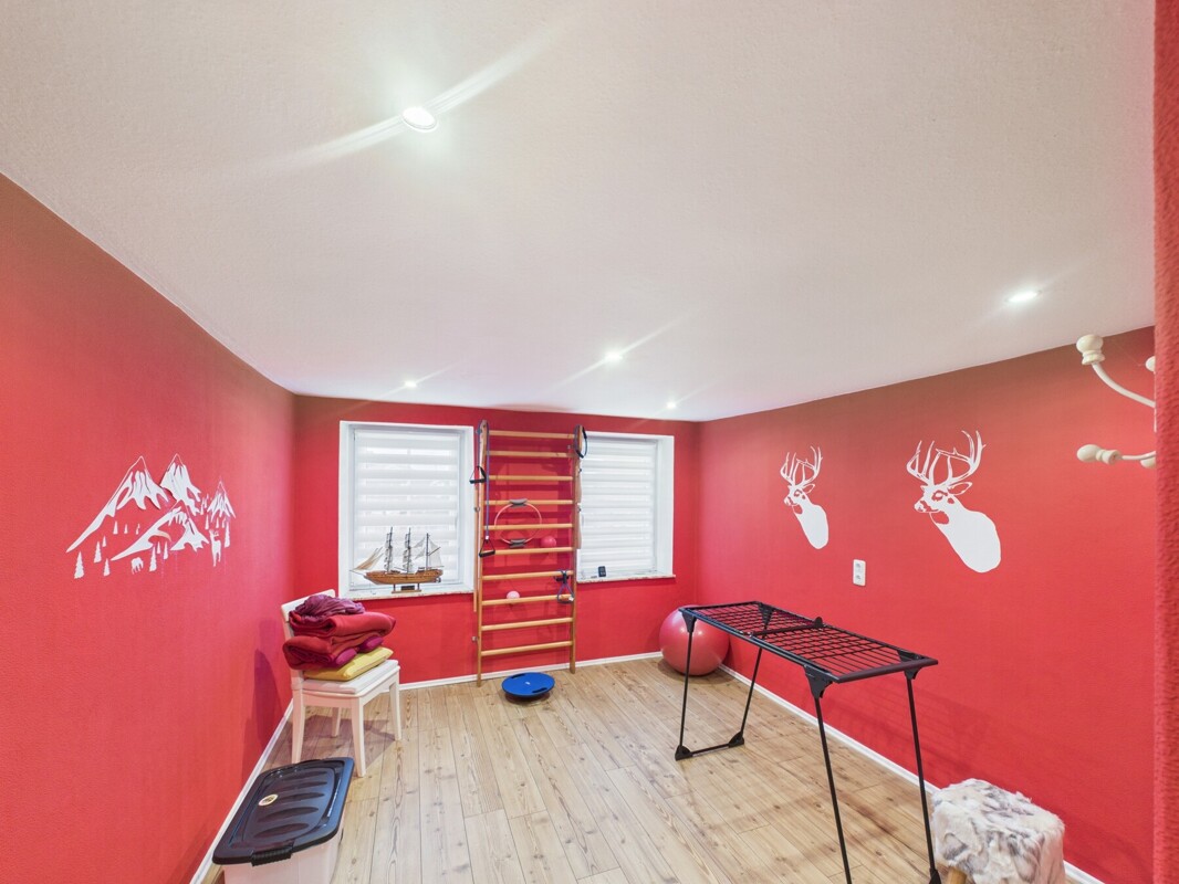 -im Erdgeschoss befindet sich in einigen Räumen unter dem verlegten Laminat noch gut erhaltenes Massivholz-Fischgrätparkett
