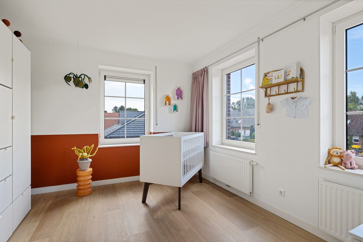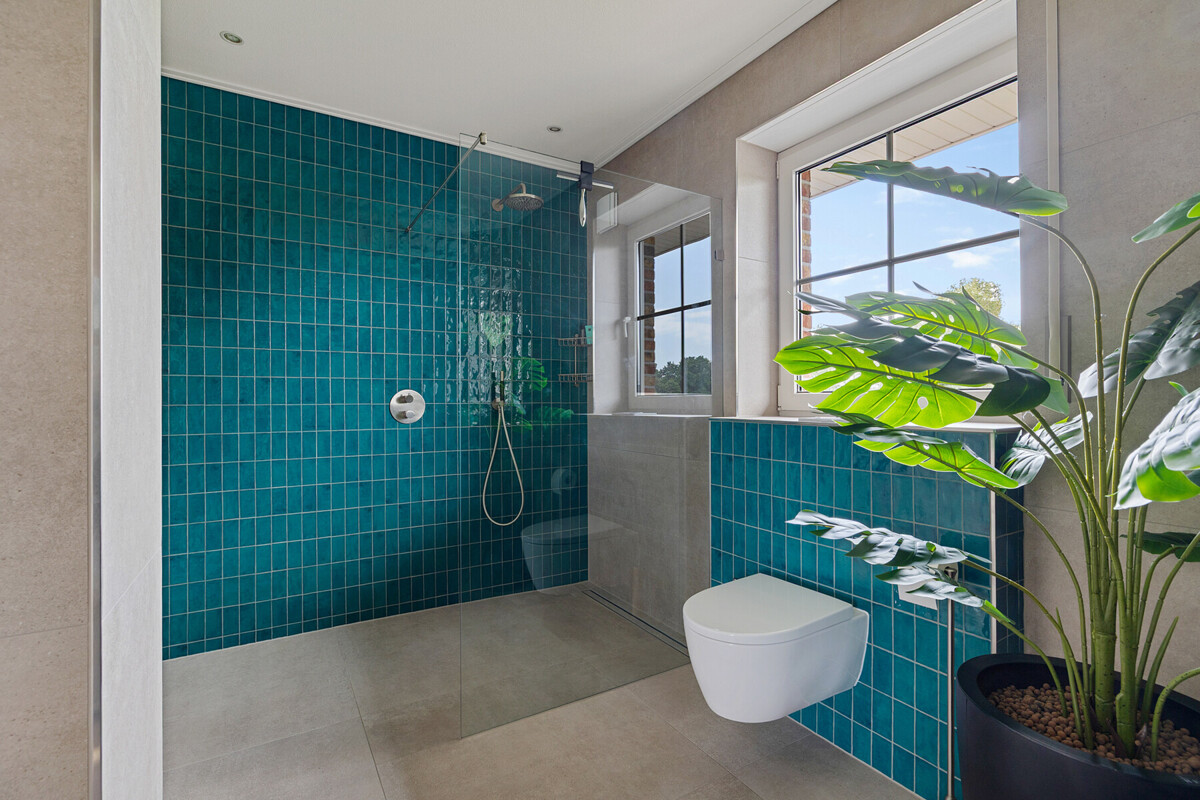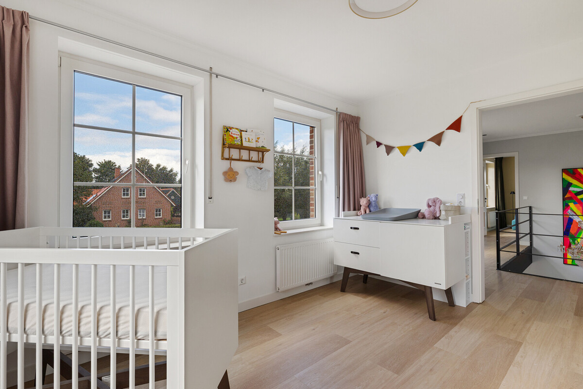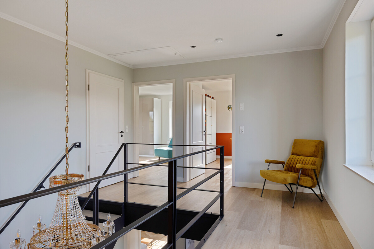 Im Obergeschoss eröffnet sich ein durchdachtes Raumkonzept: Ein rund 31 m² großes Elternschlafzimmer mit Balkonzugang, zwei weitere helle Zimmer für Kinder oder Gäste sowie ein luxuriöses Badezimmer mit Dusche, Doppelwaschbecken und WC. Auch von hier aus genießt man den Blick ins Grüne und die Ruhe der Umgebung.
