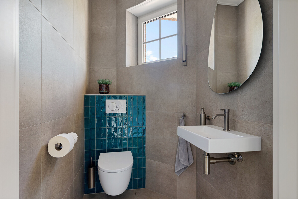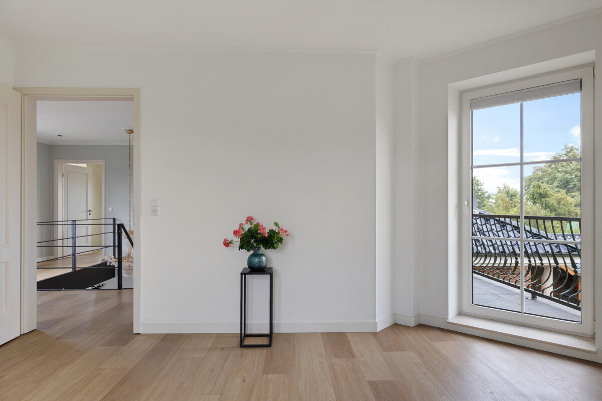 Im Inneren überzeugt die Villa mit einer eindrucksvollen Empfangshalle, in der eine neu eingebaute Designertreppe sofort ins Auge fällt. Von hier aus gelangt man in den lichtdurchfluteten Wohn- und Essbereich ausgestattet mit bodentiefen Fenstern, direktem Zugang zur Sonnenterrasse und einem Ofen. Die angrenzende Wohnküche begeistert mit einer hochwertigen Einbauküche von Siemens, ausgestattet mit modernsten Geräten. Auf derselben Ebene befinden sich außerdem ein stilvoll erneuertes Gäste-WC und ein Hauswirtschaftsraum. Ein zusätzliches Zimmer, das derzeit als Büro genutzt wird, bietet mit eigenem Duschbad flexible Nutzungsmöglichkeiten.